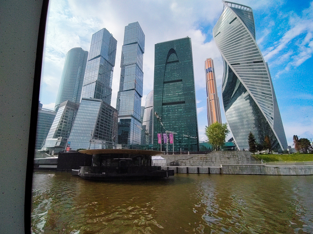 Фотография демонстрирует панорамный вид на ансамбль небоскрёбов Московского международного делового центра «Москва-Сити», снятый с уровня воды. В композиции сочетаются высотные здания разной формы и этажности, отражающиеся в поверхности реки. На переднем плане видна акватория и элементы прибрежного благоустройства. «Москва-Сити» строился с участием российских и зарубежных архитектурных бюро и стал крупнейшим деловым кластером столицы. Снимок может использоваться в материалах о современной Москве, городском развитии, архитектуре XXI века и речных маршрутах.