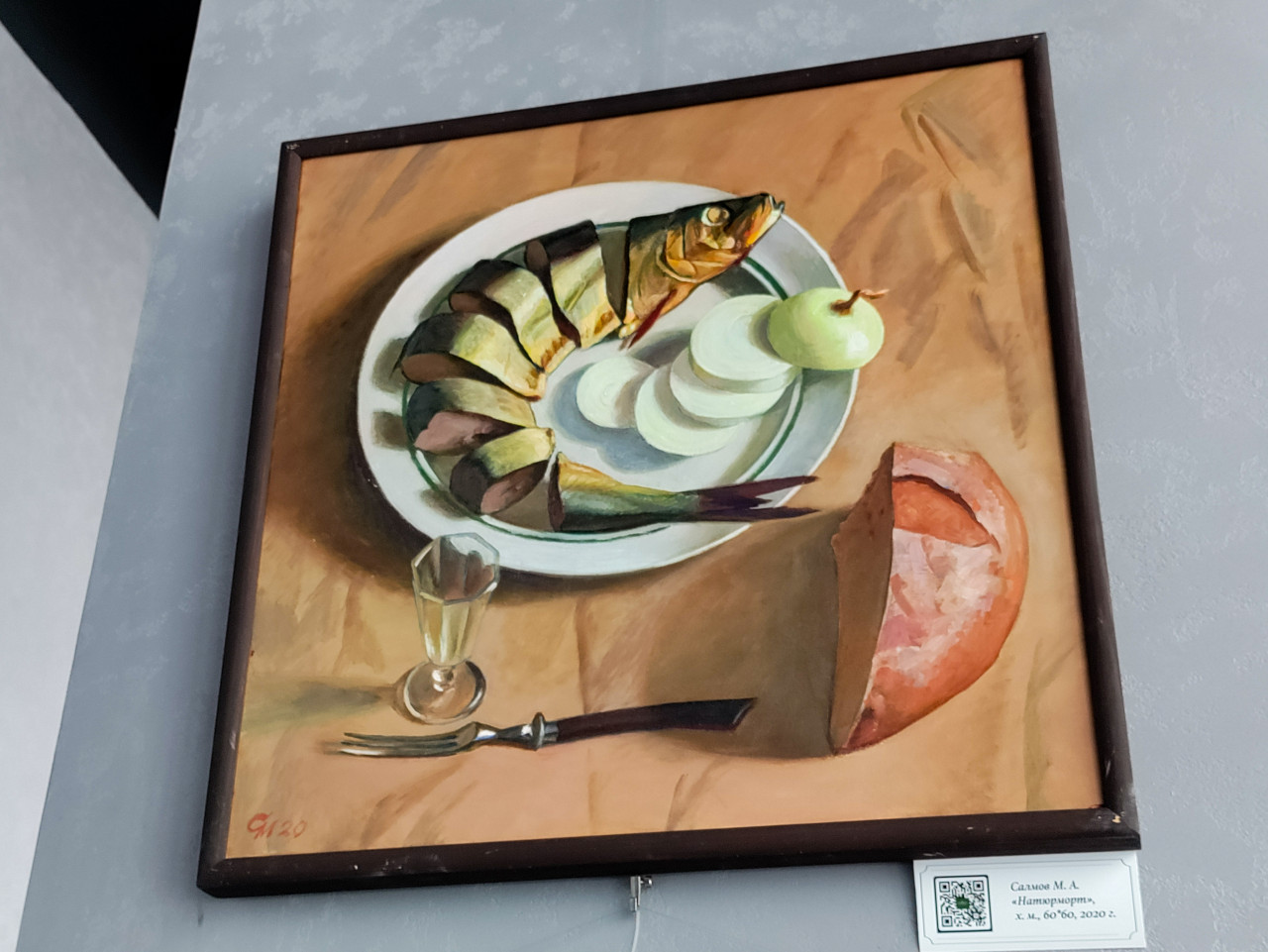 Фотография показывает живописный натюрморт, размещённый на стене выставочного пространства PANORAMA360 в Москва-Сити. В центре композиции — тарелка с нарезанной рыбой, кольца лука, кусок хлеба, вилка и рюмка, расположенные на нейтральном фоне. Работа выполнена в традициях реалистической живописи и посвящена теме повседневной трапезы. Картина оформлена в раму и снабжена информационной табличкой с указанием автора и названия. Снимок подходит для иллюстраций о классическом натюрморте и музейных экспозициях.