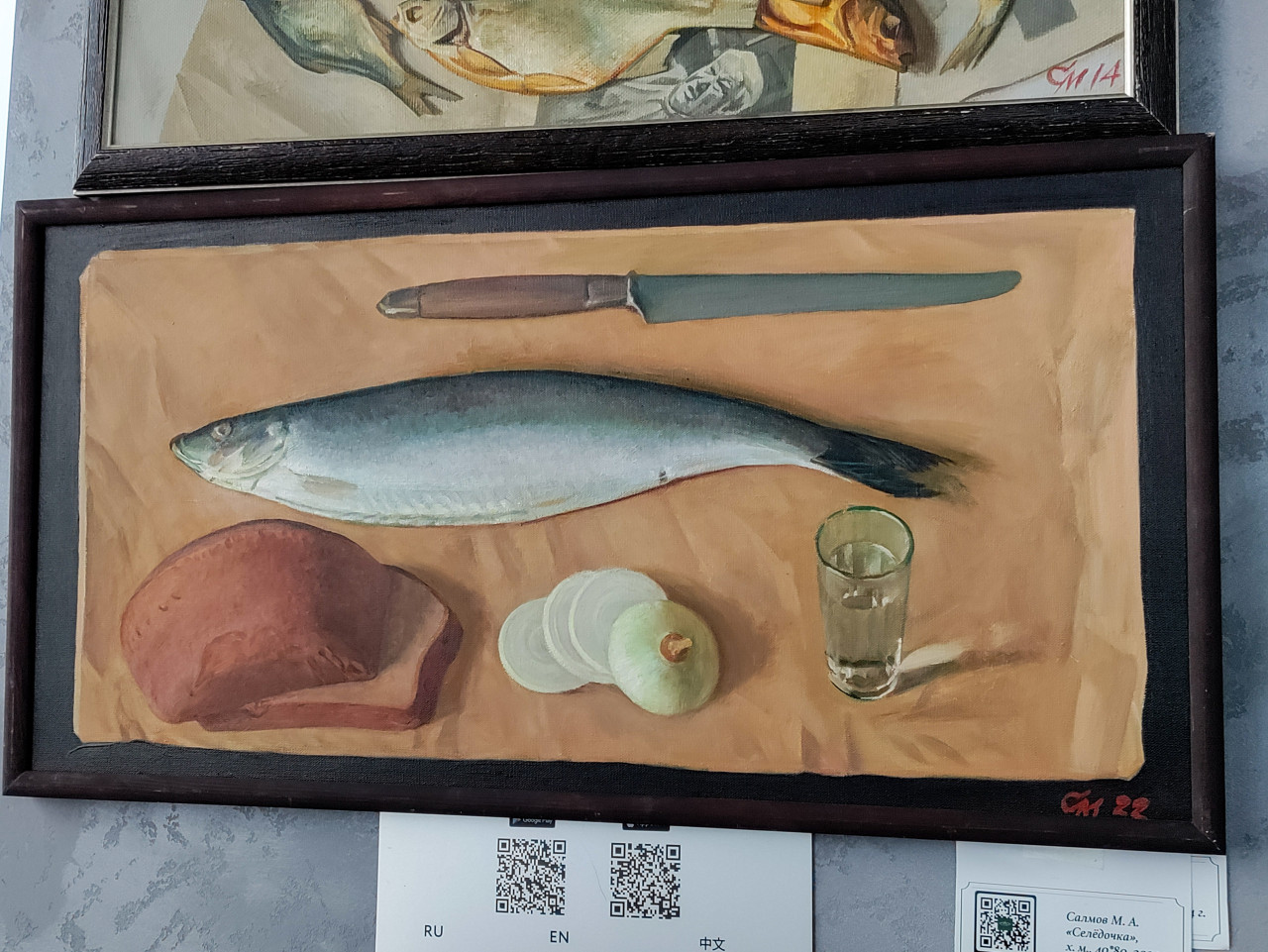 На фотографии запечатлена картина в жанре натюрморта, представленная в выставочном пространстве на 89-м этаже башни «Федерация. Восток». В композиции изображены рыба, нож, ломоть хлеба, лук и стакан, разложенные на плоскости и написанные в сдержанной цветовой гамме. Произведение относится к реалистической школе живописи и отражает тему повседневных предметов и простой еды. Картина оформлена в раму и сопровождается музейной маркировкой с QR-кодом. Фотография может использоваться в публикациях об изобразительном искусстве и выставках.
