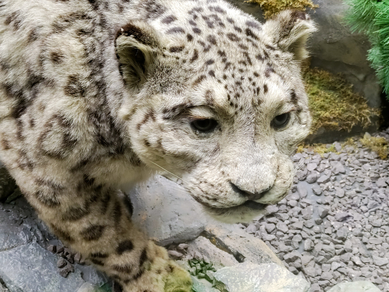 Снимок демонстрирует таксидермический экспонат снежного барса, представленный в музейной витрине. В кадре хорошо различимы характерный пятнистый мех, голова животного и элементы каменистого ландшафта. Экспозиция оформлена с использованием искусственного грунта, камней и растительности, имитирующих горную среду обитания. Снежный барс является редким хищником горных районов Азии и часто представлен в естественно-научных музеях как объект изучения и охраны природы. Фотография подходит для иллюстраций о зоологии, биологии и музейных коллекциях.