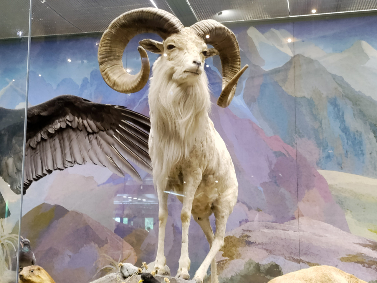 На фотографии показано чучело горного барана, установленное в музейной диораме, имитирующей высокогорный ландшафт. Животное с массивными спиралевидными рогами размещено на искусственной скале, на фоне живописной панорамы гор. В экспозиции также частично видны чучела птиц и элементы каменистого рельефа. Сцена оформлена за стеклом, что указывает на выставочный зал естественно-научного музея. Подобные экспозиции используются для демонстрации биоразнообразия горных экосистем и могут применяться в образовательных, научных и просветительских материалах.