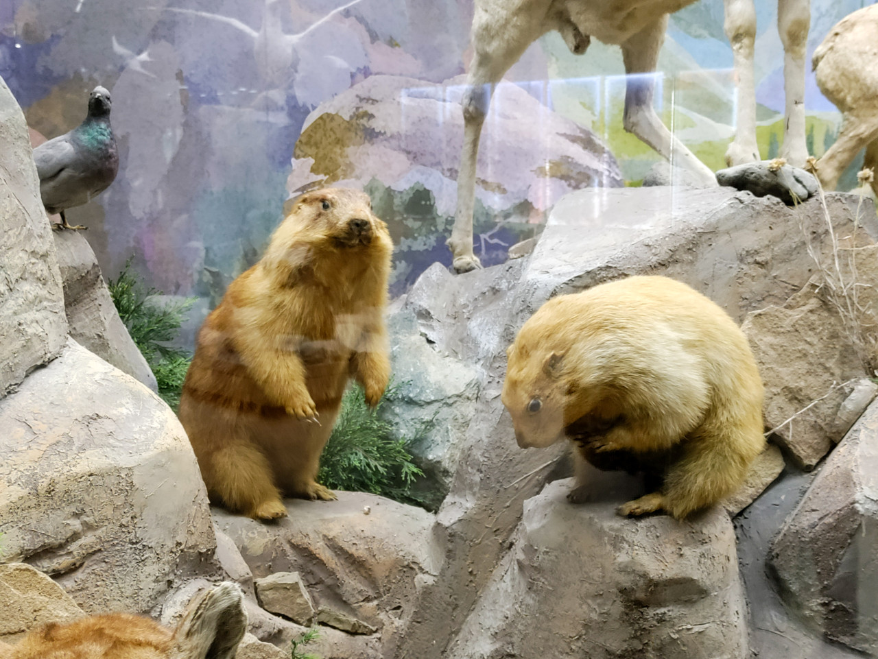 Фотография показывает часть музейной диорамы с чучелами сурков, размещённых на искусственных каменных выступах. Один сурок стоит вертикально, другой сидит, прижавшись к скале. В верхней части кадра видны ноги крупного копытного животного, что подчёркивает многовидовую композицию экспозиции. Фон оформлен в виде горного пейзажа с приглушённой цветовой гаммой. Экспозиция демонстрирует разнообразие животных горных регионов и используется в естественнонаучных музеях для образовательных и просветительских целей.