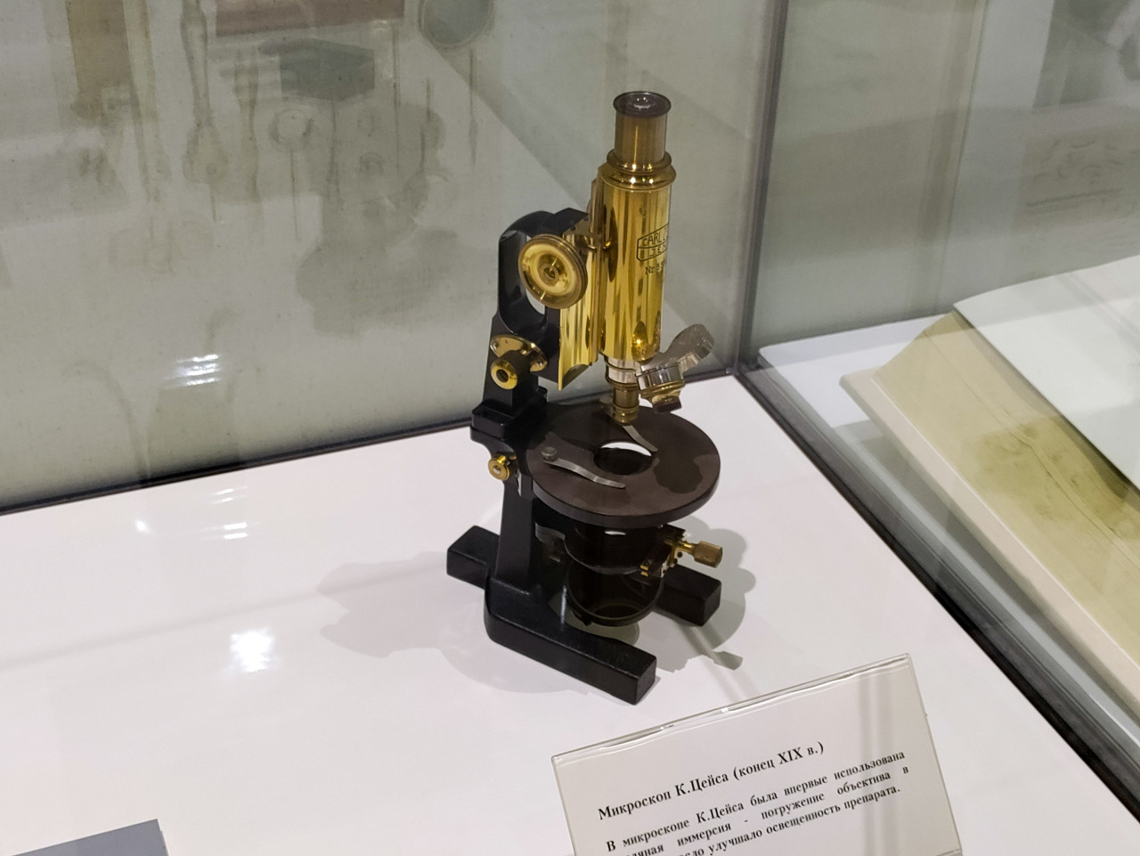 Микроскоп Карла Цейса конца XIX века в музейной витрине