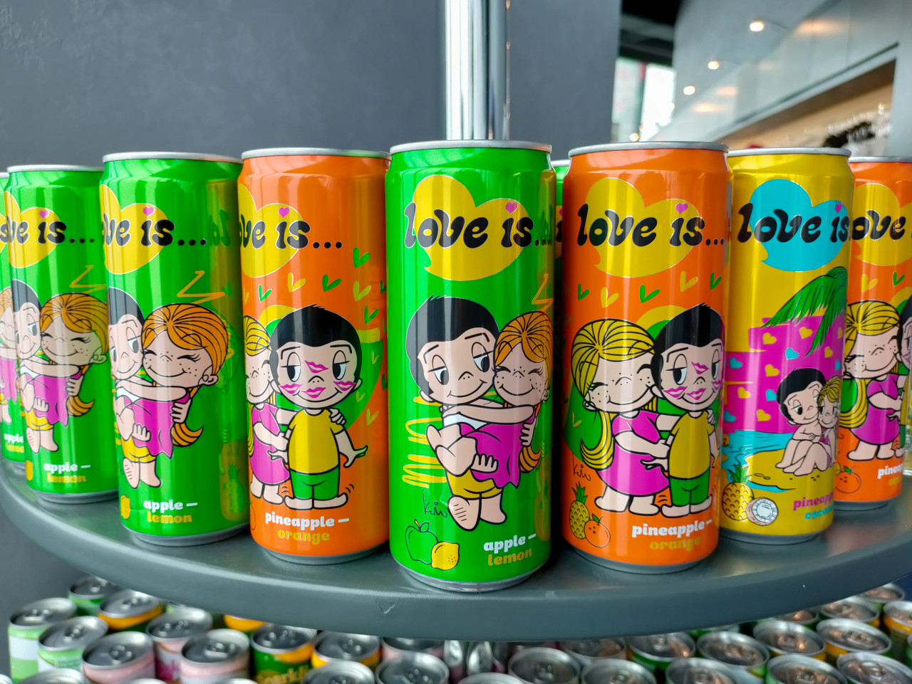 напитки безалкогольные напитки газированные напитки алюминиевая банка бренд дизайн упаковки торговая витрина продуктовая выкладка розничная торговля магазин туристический объект panorama360 москва сити башня федерация Love Is газировка иллюстрации фруктовые вкусы apple lemon pineapple orange торговая полка витрина массовая культура брендированный продукт потребительские товары гастрономия маркетинг визуальный стиль товары для туристов торговая зона яркая упаковкаПохожие фотографии