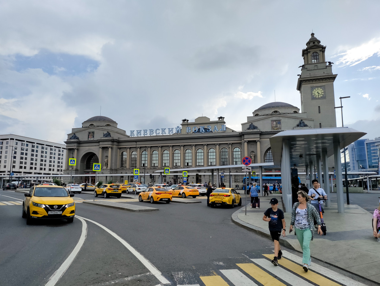 На фотографии запечатлена площадь перед Киевским вокзалом в Москве с видом на главный фасад здания и башню с часами. В кадре видны автомобили такси, проезжая часть с дорожной разметкой, пешеходный переход, остановочный павильон и прохожие. Киевский вокзал построен в 1914–1918 годах по проекту архитектора Ивана Рерберга и инженера Владимира Шухова и является одним из крупнейших железнодорожных вокзалов столицы. Снимок подходит для иллюстраций городской инфраструктуры, транспорта, архитектуры Москвы и туристических материалов.