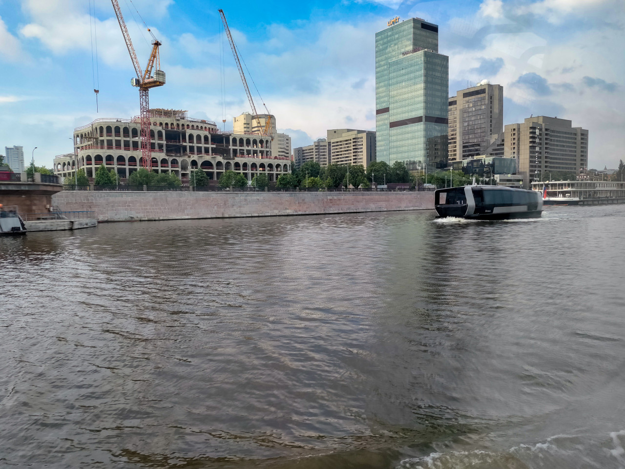 город москва река водный транспорт пассажирское судно речные перевозки общественный транспорт набережная инфраструктура урбанистика городской пейзаж транспорт Москва река офисные здания современная застройка строительство краны инфраструктура города городской транспорт деловой район прибрежная зона движение мегаполис дневная съёмка берег реки городской ландшафт туристический маршрут центр городаПохожие фотографии
