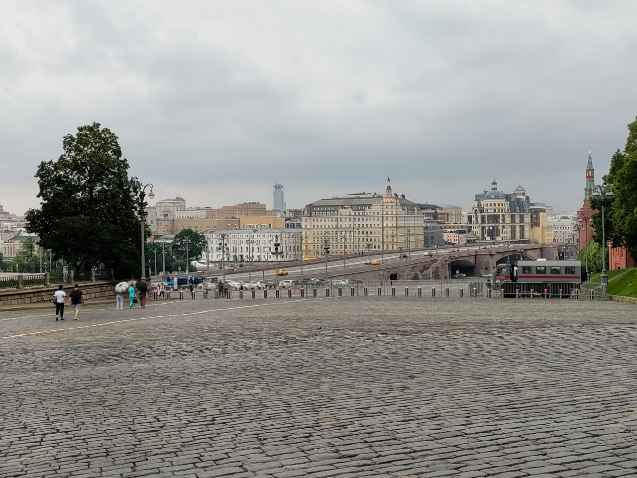 Фотография показывает панорамный вид с Красной площади в сторону городского пространства за пределами Кремля. На переднем плане заметна широкая брусчатая площадь, далее — проезжая часть, мост и городская застройка с многоэтажными зданиями различного периода. В кадре присутствуют пешеходы, элементы уличного освещения и транспортная инфраструктура. Снимок сделан при пасмурной погоде, что подчёркивает масштаб пространства и протяжённость городской перспективы. Фотография может использоваться в материалах о городской среде Москвы, транспортной инфраструктуре, урбанистике и туризме.