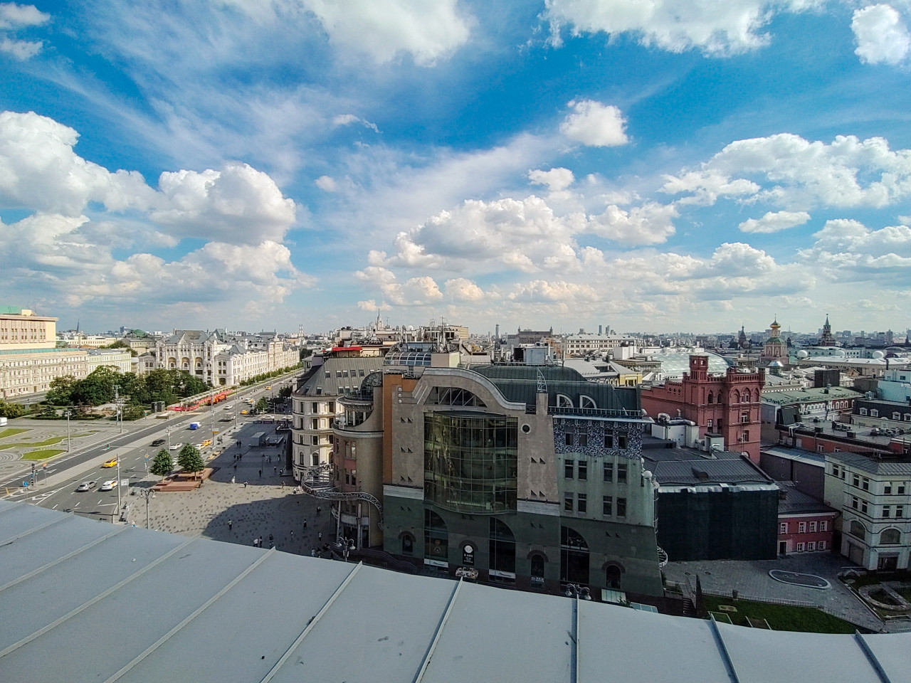 На фотографии представлен обзор центральной части Москвы, выполненный с высокой точки. В кадре различимы крупные городские магистрали, здания с историческими фасадами, современные архитектурные объекты и общественные пространства. На дальнем плане заметны купола и башни храмов, подчёркивающие историческую преемственность городской среды. Небо с рассеянными облаками создаёт равномерное освещение сцены. Изображение подходит для использования в туристических буклетах, статьях об архитектуре Москвы, материалах о городской инфраструктуре и визуальных проектах о столице.