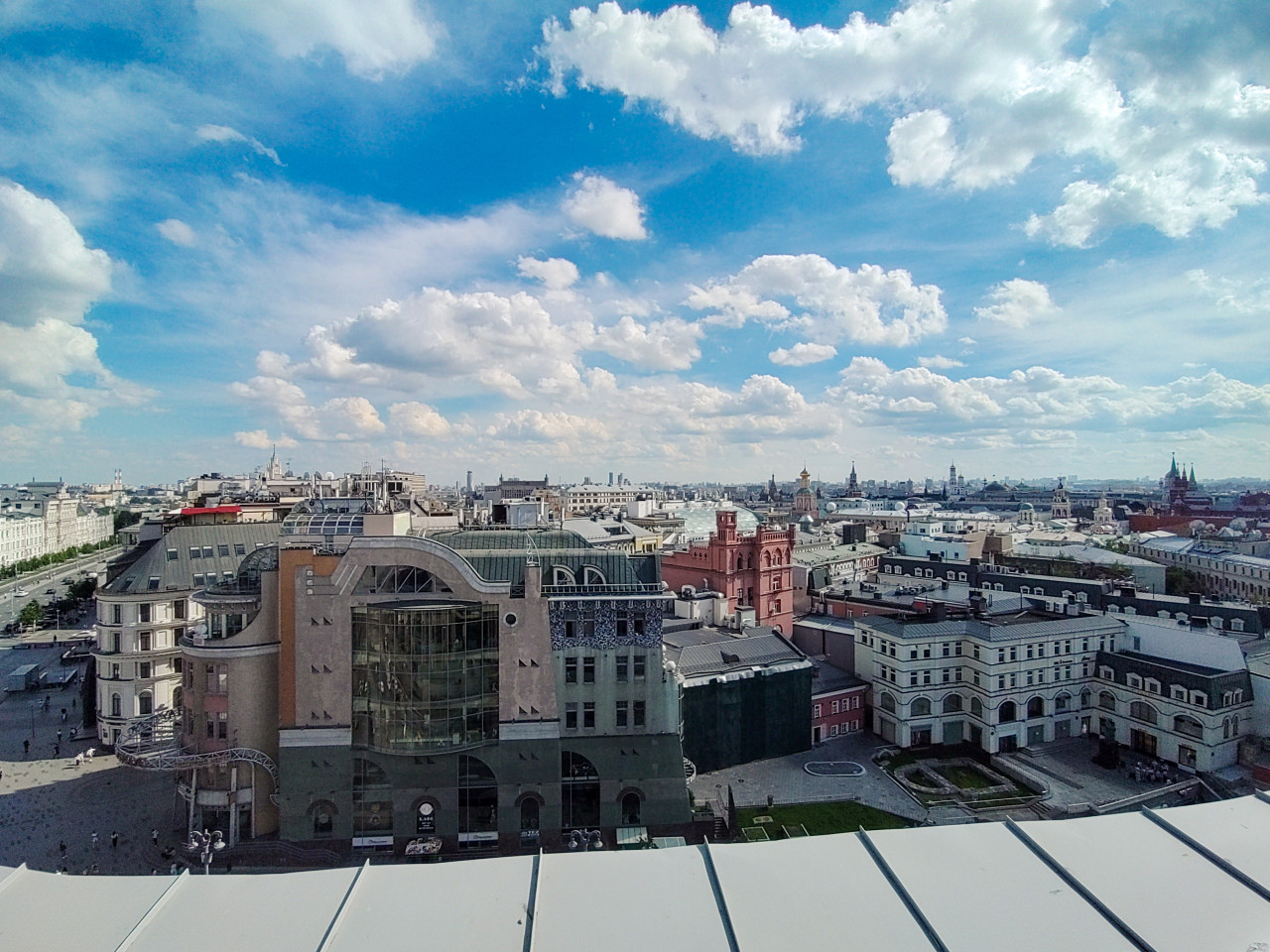 Фотография демонстрирует панорамный вид Москвы, где сочетаются современные здания с остеклёнными фасадами и исторические постройки центральных районов. В кадре видны улицы, площади, крыши домов и внутренние дворы, а также удалённые архитектурные доминанты, формирующие облик города. Небо с выразительными облаками подчёркивает масштаб и протяжённость городской застройки. Снимок может использоваться в материалах о городской архитектуре, развитии мегаполиса, туристических обзорах и публикациях о столице России.