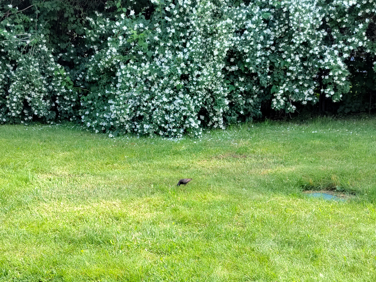 На изображении показан участок ухоженного газона, на котором находится небольшая тёмная птица, клюющая траву. Фон кадра занимает густая зелёная растительность с обильным цветением белых цветов, формирующая естественную стену из кустарников. Видны неравномерные пятна травяного покрова и мягкие тени от листвы, указывающие на солнечную погоду. Фотография отражает взаимодействие городской среды и живой природы и подходит для иллюстраций о парках, экологии мегаполиса, сезонных изменениях и городской орнитофауне.