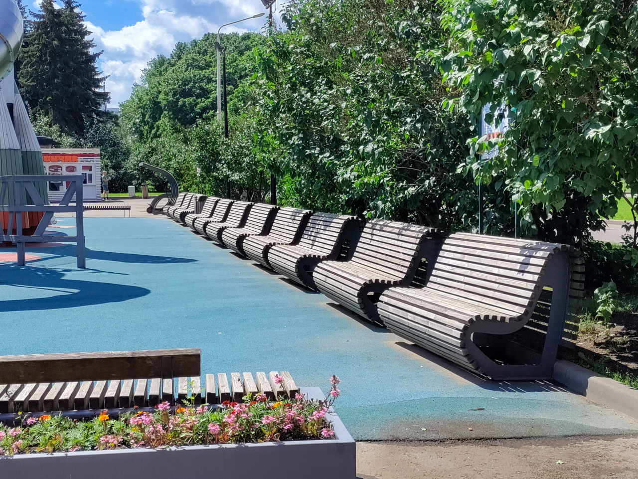 На снимке представлена благоустроенная зона отдыха с рядом современных уличных скамеек необычной формы, установленных на прорезиненном покрытии голубого цвета. Слева частично видна конструкция детской игровой площадки с металлической горкой и башней. Территория окружена зелёными насаждениями и деревьями, обеспечивающими тень. Съёмка выполнена в солнечную погоду, что подчёркивает чистоту и функциональность пространства. Фотография может использоваться для иллюстрации тем благоустройства, городской среды, общественных пространств и семейного досуга.