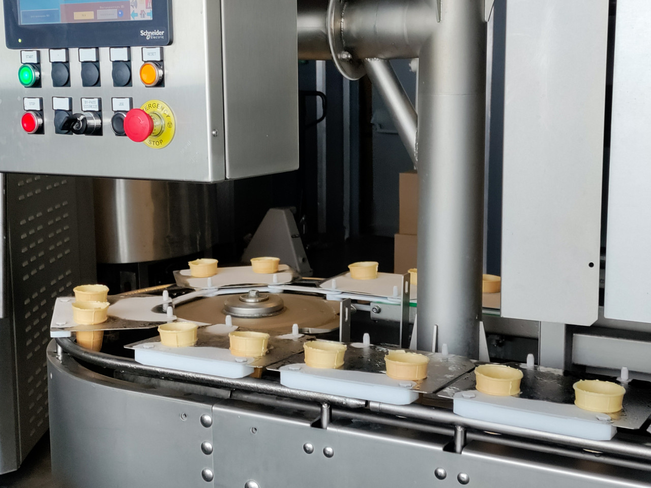 Конвейер с вафельными стаканчиками перед фасовкой мороженого