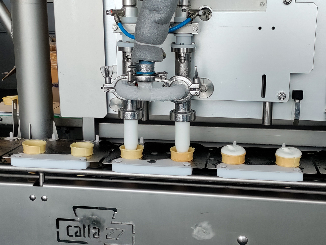 Процесс наполнения вафельных стаканчиков мороженым на конвейере