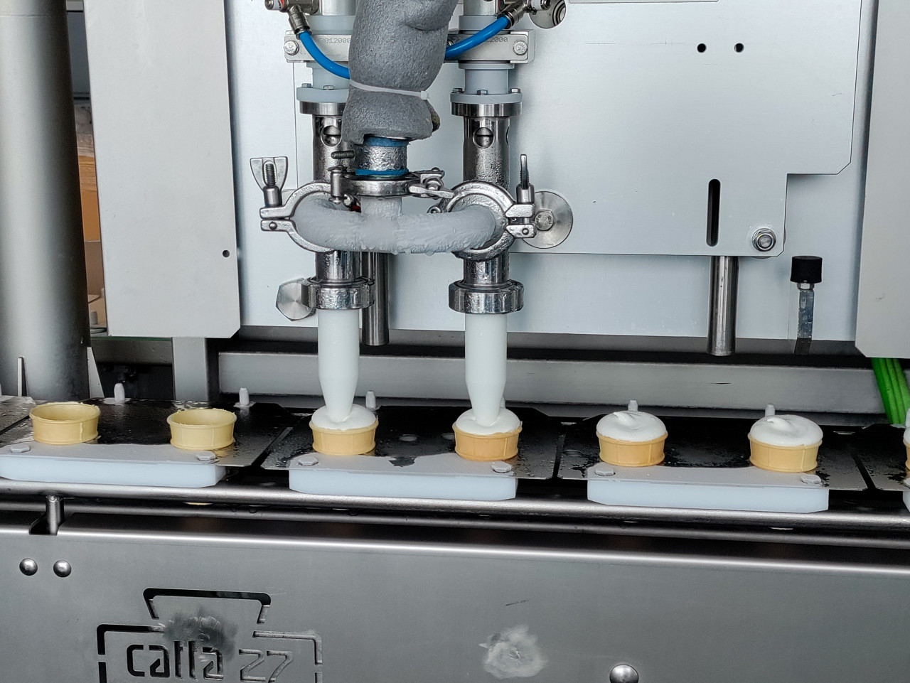 Процесс наполнения вафельных стаканчиков мороженым на конвейере