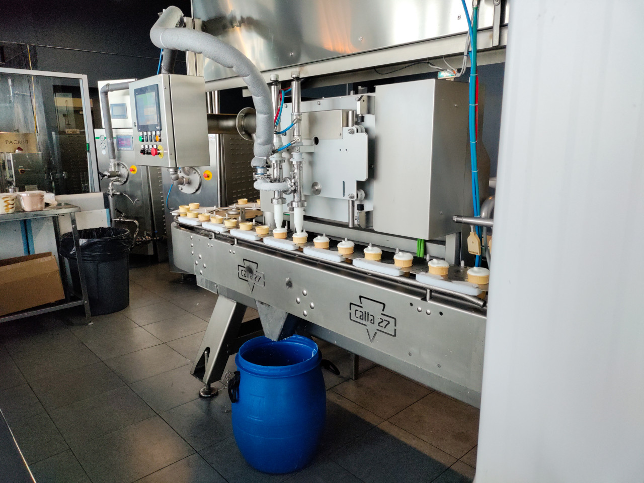 На фотографии показан участок действующей производственной линии фабрики мороженого «Чистая линия», расположенной на смотровой площадке PANORAMA360 в башне «Федерация. Восток» в Москва-Сити. В кадре виден конвейер со стаканчиками, автоматические дозаторы, металлические корпуса оборудования, трубопроводы и элементы управления. Линия предназначена для фасовки мороженого и повторяет технологию основной фабрики в Долгопрудном. Фабрика размещена на высоте 327 метров на 89-м этаже и внесена в Книгу рекордов России как самая высокая фабрика мороженого. Фотография может использоваться в материалах о пищевой промышленности, гастрономическом туризме, индустрии развлечений и смотровых площадках.