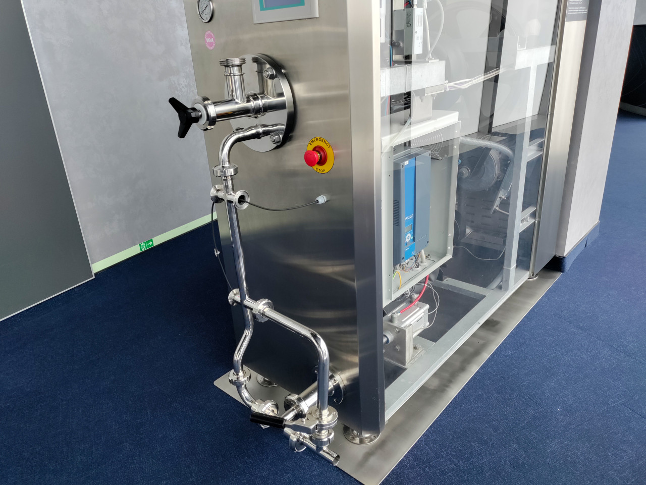 На снимке представлен фрагмент промышленного фризера, демонстрирующий систему трубопроводов, вентилей и аварийную кнопку остановки. Видны металлические соединения, краны и элементы подачи продукта, смонтированные на корпусе оборудования из нержавеющей стали. Аппарат экспонируется на фабрике «Чистая линия» в Москва-Сити и используется для наглядного показа устройства машин непрерывного действия. Фотография акцентирует внимание на инженерных решениях и санитарных требованиях пищевого производства. Изображение подходит для иллюстрации материалов о промышленной технике и технологиях переработки продуктов.