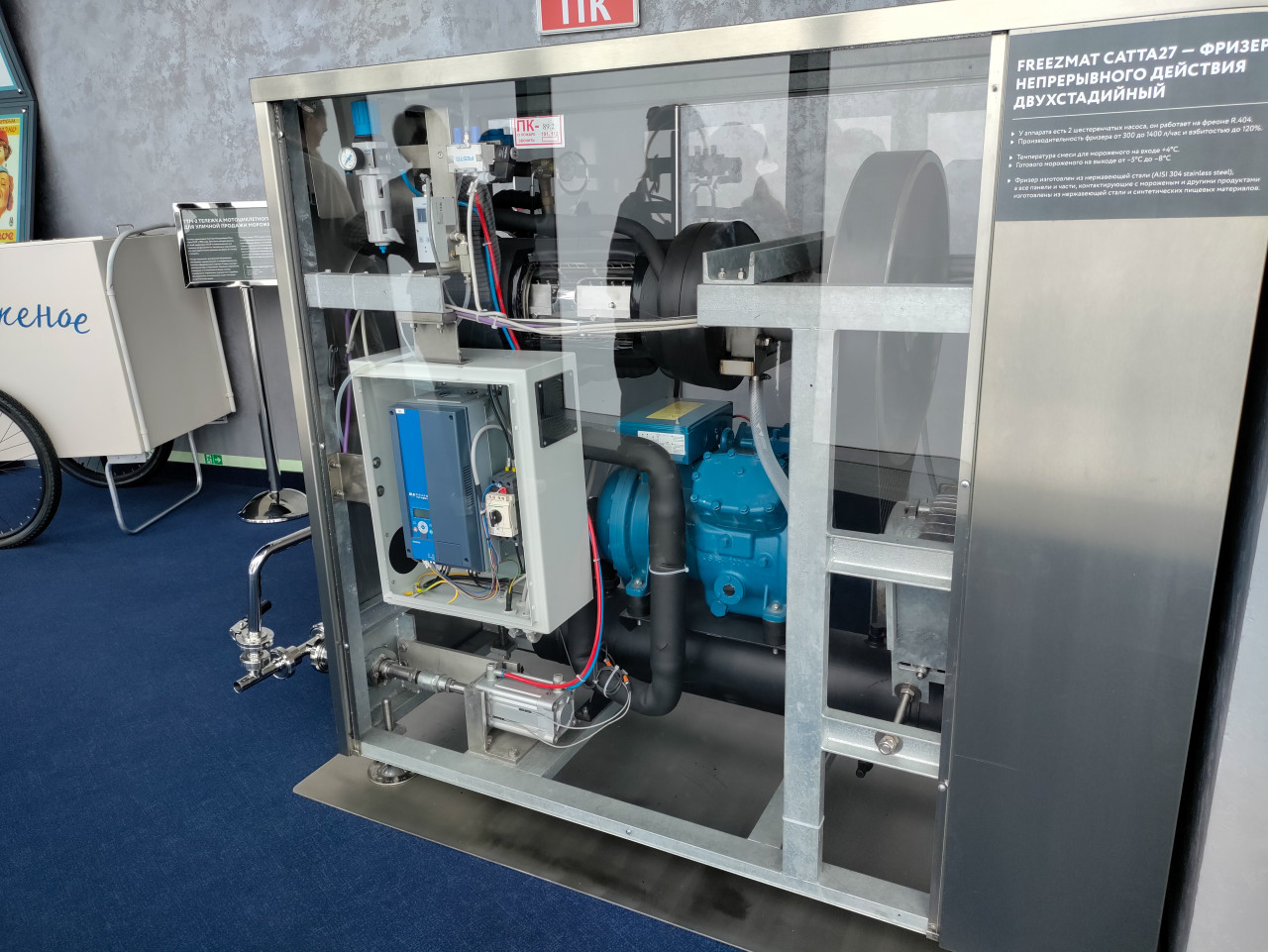 На фотографии показан фризер непрерывного действия Catta 27 с прозрачными защитными панелями, через которые видны внутренние узлы оборудования. В кадре различимы компрессорный модуль, трубопроводы, электрический шкаф управления, ременная передача и элементы рамы. Экспонат установлен в экспозиции фабрики мороженого «Чистая линия» в Москва-Сити и используется для демонстрации промышленной технологии замораживания и взбивания смеси. Оборудование иллюстрирует принцип работы современных линий производства мороженого и применяется в образовательном формате экскурсии PANORAMA360. Фотография подходит для материалов о пищевой промышленности и инженерных решениях.