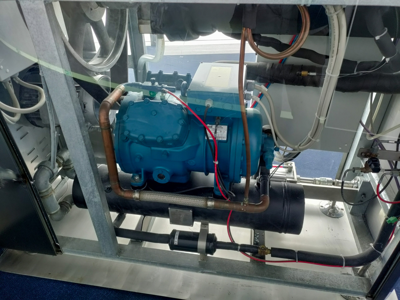 Фотография демонстрирует внутренний компрессорный модуль промышленного фризера, расположенный за прозрачной защитной панелью. В кадре видны компрессор, трубки хладагента, кабели и элементы системы охлаждения. Оборудование является частью линии по производству мороженого и используется для поддержания необходимого температурного режима. Экспонат размещён в демонстрационной зоне фабрики «Чистая линия» в Москва-Сити и позволяет посетителям увидеть техническую сторону процесса заморозки. Снимок может использоваться в образовательных и технических материалах.