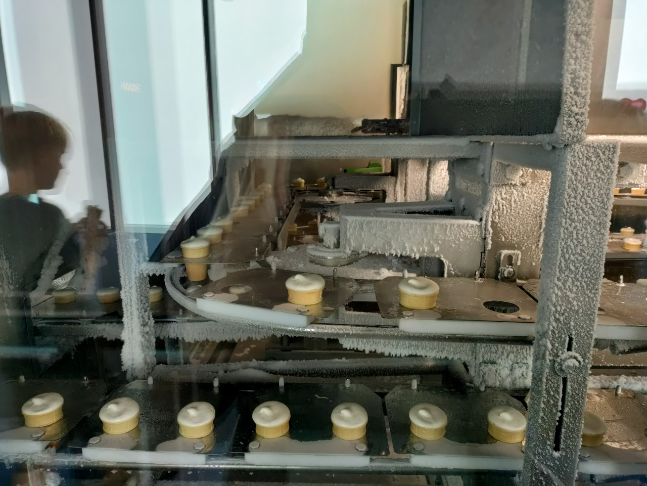 На фотографии показан фрагмент автоматизированной производственной линии фабрики мороженого «Чистая линия», расположенной на смотровой площадке PANORAMA360 в башне «Федерация. Восток» комплекса «Москва-Сити». В кадре видны вафельные стаканчики с порциями мороженого, движущиеся по металлическому конвейеру внутри охлаждённого бокса, покрытого инеем. Снимок иллюстрирует этап формования и охлаждения продукта в условиях действующего производства на высоте 327 метров. Фотография может использоваться в материалах о пищевой промышленности, технологиях производства, гастрономическом туризме и индустриальных экскурсиях.