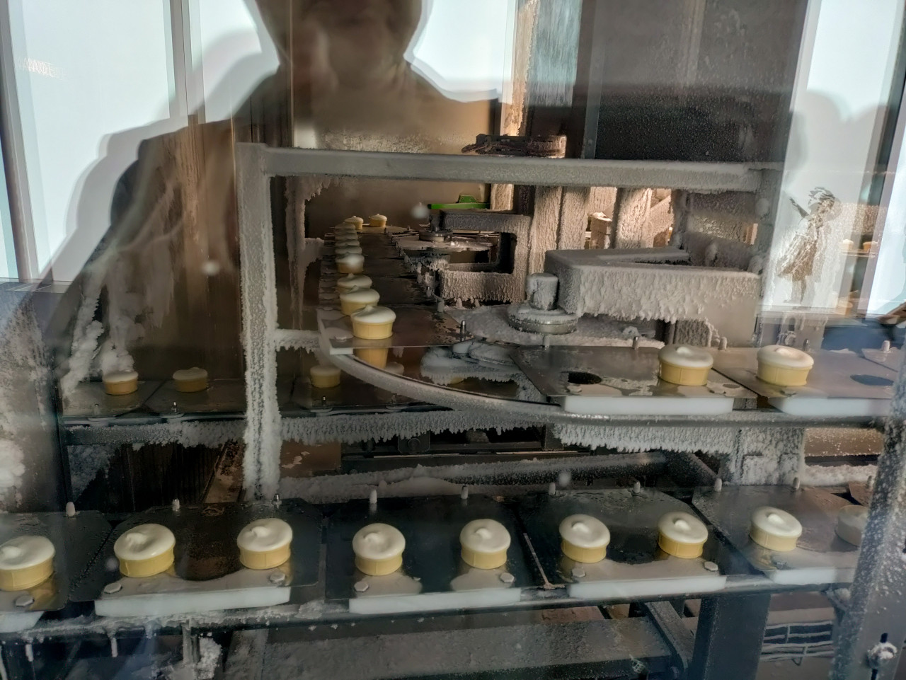 Фотография запечатлела внутреннее пространство охлаждённой камеры фабрики мороженого «Чистая линия» на смотровой площадке PANORAMA360 в Москве-Сити. В кадре виден изогнутый участок конвейера, по которому перемещаются вафельные стаканчики с мороженым, а также металлические элементы механизма, покрытые слоем инея. Снимок демонстрирует реальный производственный процесс, доступный для наблюдения посетителям. Изображение подходит для иллюстрации тем, связанных с промышленными технологиями, пищевым производством, автоматизированными линиями и экскурсионными форматами.