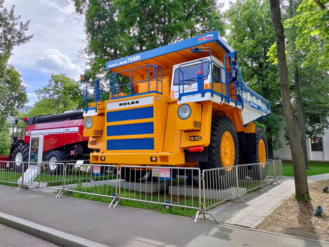 На фотографии изображён карьерный самосвал БелАЗ-75581, установленный на открытой экспозиции ВДНХ за выставочным корпусом «Беларусь», на Южной аллее. Машина представлена как демонстрационный образец тяжёлой карьерной техники. В кадре хорошо виден массивный корпус самосвала, огромные колёса и фирменная жёлто-синяя окраска. На передней части размещён логотип «БелАЗ», на борту — номер модели 75581. Экспозиция огорожена для безопасности посетителей и используется для демонстрации достижений белорусского машиностроения.