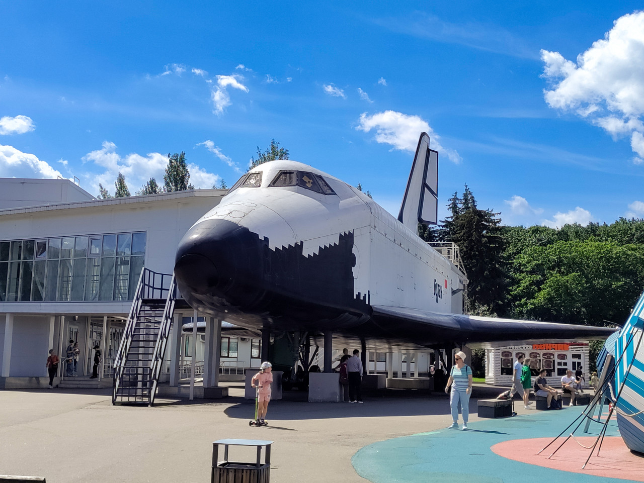 На фотографии запечатлён орбитальный корабль «Буран», установленный на открытой площадке ВДНХ в Москве. В кадре видна носовая часть корабля, крыло, посадочные опоры, а также посетители, находящиеся рядом с экспонатом. «Буран» — советский многоразовый космический корабль, созданный в рамках одноимённой космической программы и совершивший единственный автоматический орбитальный полёт в 1988 году. Экспозиция является частью музейно-выставочного пространства ВДНХ и используется для просветительских и туристических целей.