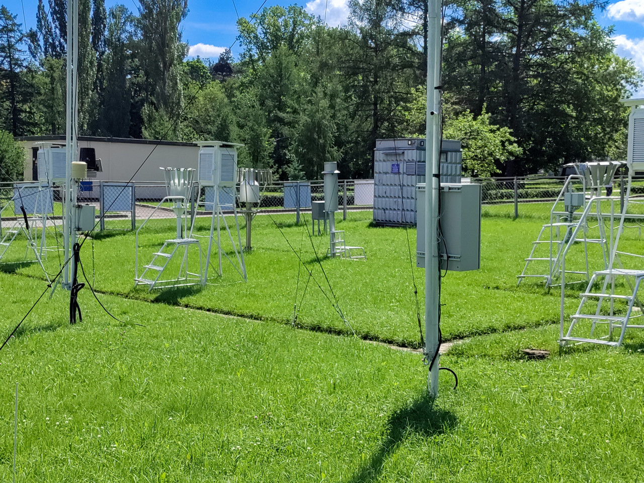 На изображении показана ограждённая территория метеорологической площадки ВДНХ с установленными приборами для наблюдений за погодными условиями. В кадре присутствуют металлические стойки с датчиками, служебные шкафы, кабельные линии, газон и деревья на фоне. Площадка используется для научных и прикладных наблюдений в рамках работы Росгидромета и выставочной экспозиции. Фотография может быть использована в контексте науки, экологии, образования и климатического мониторинга.