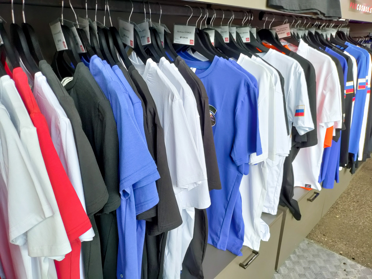 На снимке изображён ряд футболок, размещённых на плечиках в торговой зоне ВДНХ. В кадре представлены изделия разных цветов с нашивками в виде флага России и элементами космического дизайна. Одежда является частью тематического ассортимента, посвящённого космосу и российской космической отрасли. Фотография отражает формат сувенирной торговли внутри выставочного комплекса и подходит для материалов о мерче, розничной продаже и популяризации науки через дизайн и текстиль.