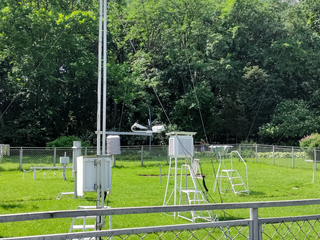 Снимок демонстрирует участок метеорологической станции на ВДНХ с установленными датчиками и измерительными устройствами. В кадре различимы приборные стойки, служебные шкафы, кабельные линии, металлические лестницы для обслуживания оборудования и ограждение. Комплекс относится к системе Росгидромета и применяется для сбора данных о состоянии атмосферы. Фотография может использоваться в материалах о погоде, климатических наблюдениях, научных методах измерений и экологическом мониторинге.