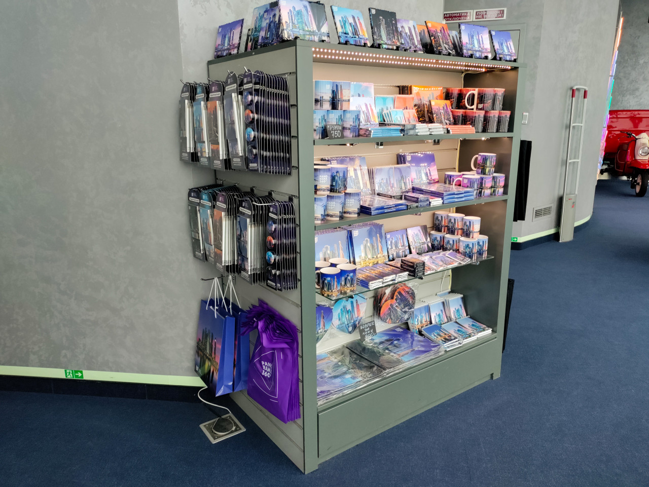туризм сувениры сувенирная продукция магазин торговая зона розничная торговля мерч интерьер общественное пространство туристический объект panorama360 москва сити башня федерация городской туризм экскурсия открытки блокноты кружки торговый стеллаж смотровая площадка PANORAMA360 Москва Сити башня Федерация городской пейзаж символика города витрина товары для туристов дизайн интерьераПохожие фотографии