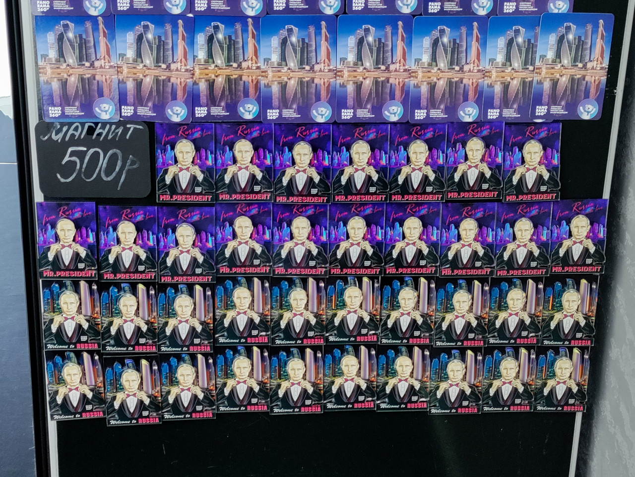 На фотографии показан торговый стенд с сувенирными магнитами, на которых размещён стилизованный портрет Владимира Путина. Магниты оформлены в яркой иллюстративной манере с фоном в виде небоскрёбов Москва-Сити и надписями на английском языке, отсылающими к России. Экспозиция расположена в сувенирной зоне смотровой площадки PANORAMA360 в башне «Федерация. Восток» комплекса «Москва-Сити». Снимок фиксирует популярный формат туристической сувенирной продукции с политической символикой и может использоваться в редакционных, исследовательских и архивных материалах о массовой культуре, туризме и визуальном образе современной России.