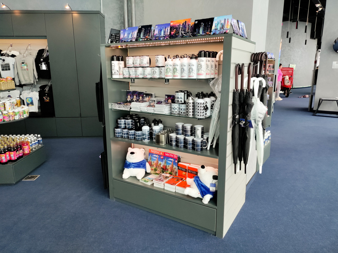 На фотографии изображена сувенирная стойка, расположенная в пространстве смотровой площадки PANORAMA360 в башне «Федерация. Восток» комплекса «Москва-Сити». В кадре представлены кружки, бутылки, зонты, открытки и мягкие игрушки с символикой Москвы, аккуратно размещённые на многоуровневом стеллаже. Снимок отражает торгово-выставочную зону, дополняющую экскурсионный и развлекательный формат площадки. Фотография может использоваться в материалах о туристической инфраструктуре, сувенирной продукции и общественных пространствах.