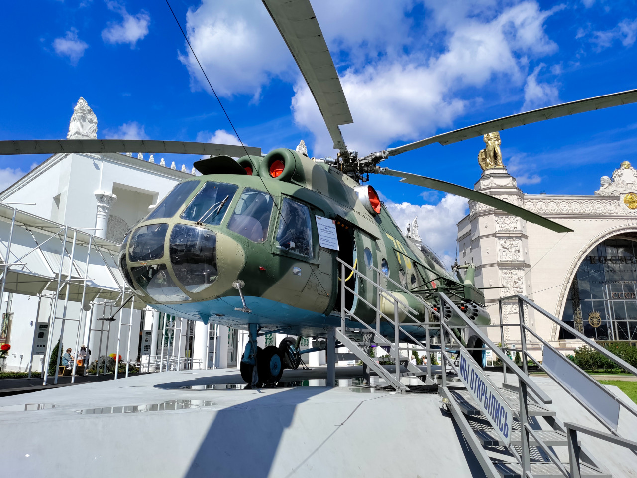 На изображении представлен вертолёт Ми-8, установленный на специальной платформе в составе открытой экспозиции ВДНХ. Хорошо видны кабина экипажа, несущий винт, элементы фюзеляжа и трап для осмотра интерьера. На фоне находятся павильоны ВДНХ с декоративной лепниной и скульптурами. Экспозиция отражает развитие советской и российской вертолётной техники и имеет культурно-историческое значение. Фотография подходит для музейных, образовательных и исторических публикаций.