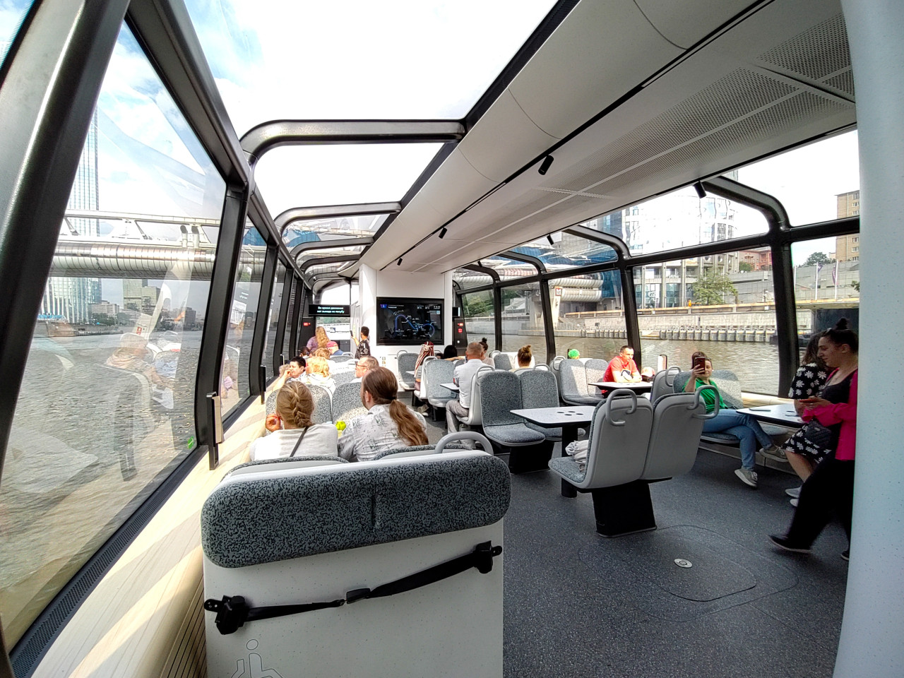 На изображении показан интерьер современного речного трамвая с панорамным остеклением, курсирующего по Москве-реке. В кадре видны пассажирские сиденья, столики, информационный экран и пассажиры во время поездки. Через стеклянные стены и крышу просматривается городская застройка и набережная. Такие суда используются для регулярных маршрутов и экскурсионных прогулок, сочетая общественный транспорт и туристическую функцию. Фотография подходит для тем, связанных с городским транспортом, туризмом, речными перевозками и современной инфраструктурой Москвы.