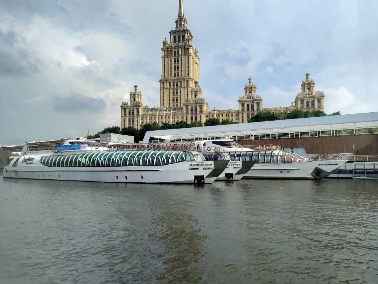 город москва москва река водный транспорт речной транспорт пассажирское судно общественный транспорт городской транспорт городской пейзаж центр города урбанистика туристический маршрут Москва Москва река прогулочный теплоход Фердинанд речная прогулка причал набережная гостиница Украина сталинская высотка архитектура культурное наследие историческое здание туризм экскурсии водный маршрут судоходство дневной свет лето облачное небо инфраструктураПохожие фотографии