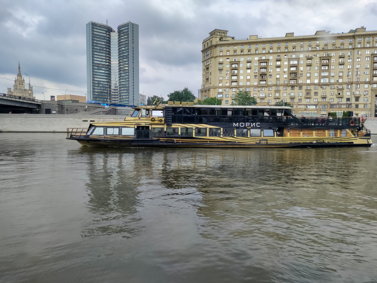 Прогулочный теплоход «Морис» у высотных зданий Москвы