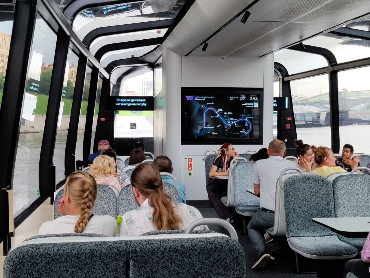 На снимке показан интерьер современного речного электросудна, курсирующего по Москве-реке. В кадре видны панорамные боковые окна, прозрачная крыша, мягкие сиденья для пассажиров и большой цифровой экран с отображением маршрута движения. Пассажиры расположены в салоне во время рейса, за окнами просматривается берег и мостовые конструкции. Фотография подходит для иллюстраций на темы общественного транспорта, инновационных решений в городской среде и развития речной навигации в Москве.