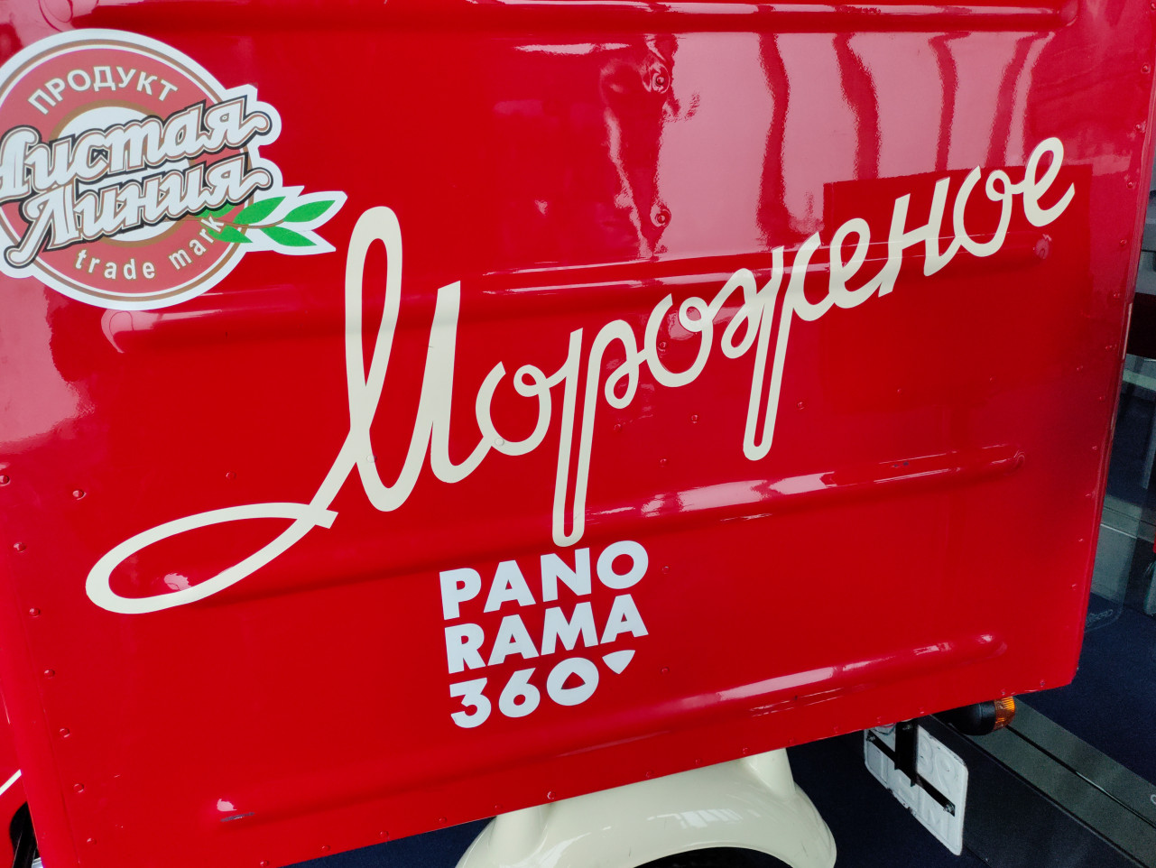 Крупным планом показан боковой элемент грузового кузова мотороллера «Муравей», окрашенный в красный цвет и украшенный фирменной надписью «Мороженое» и логотипом фабрики «Чистая линия». Экспонат является частью музейной зоны на смотровой площадке PANORAMA360 в башне «Федерация. Восток» Москва-Сити. Такое оформление отсылает к визуальной культуре советской уличной торговли и фирменным передвижным точкам продажи мороженого. Фотография может быть использована для иллюстрации тем брендинга, истории рекламы и музейного дизайна.