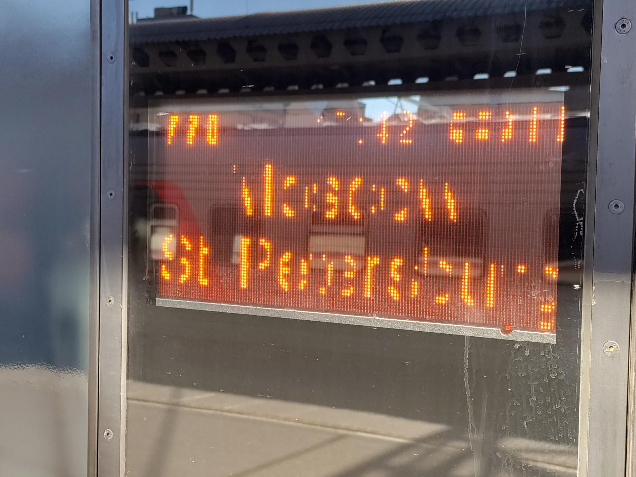 На изображении показано электронное табло расписания, размещённое на платформе железнодорожной станции. На светодиодном дисплее отображается информация о поезде, времени и направлении движения. Табло заключено в металлическую раму и защищено стеклом, на котором заметны отражения окружающего пространства платформы. Такие устройства используются на вокзалах для оперативного оповещения пассажиров и организации посадки. Снимок может применяться в материалах о транспорте, логистике и городской инфраструктуре.