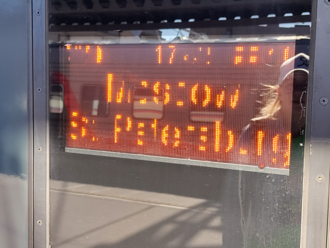 Фотография демонстрирует электронное табло с данными о движении поездов, установленное на железнодорожной платформе. На экране отображается информация о номере и маршруте поезда, времени прибытия и пути следования, выполненная светящимися символами. Корпус табло встроен в металлическую конструкцию, поверхность стекла отражает элементы станции и подвижного состава. Подобные табло являются обязательной частью современной вокзальной инфраструктуры и используются для ориентации пассажиров.