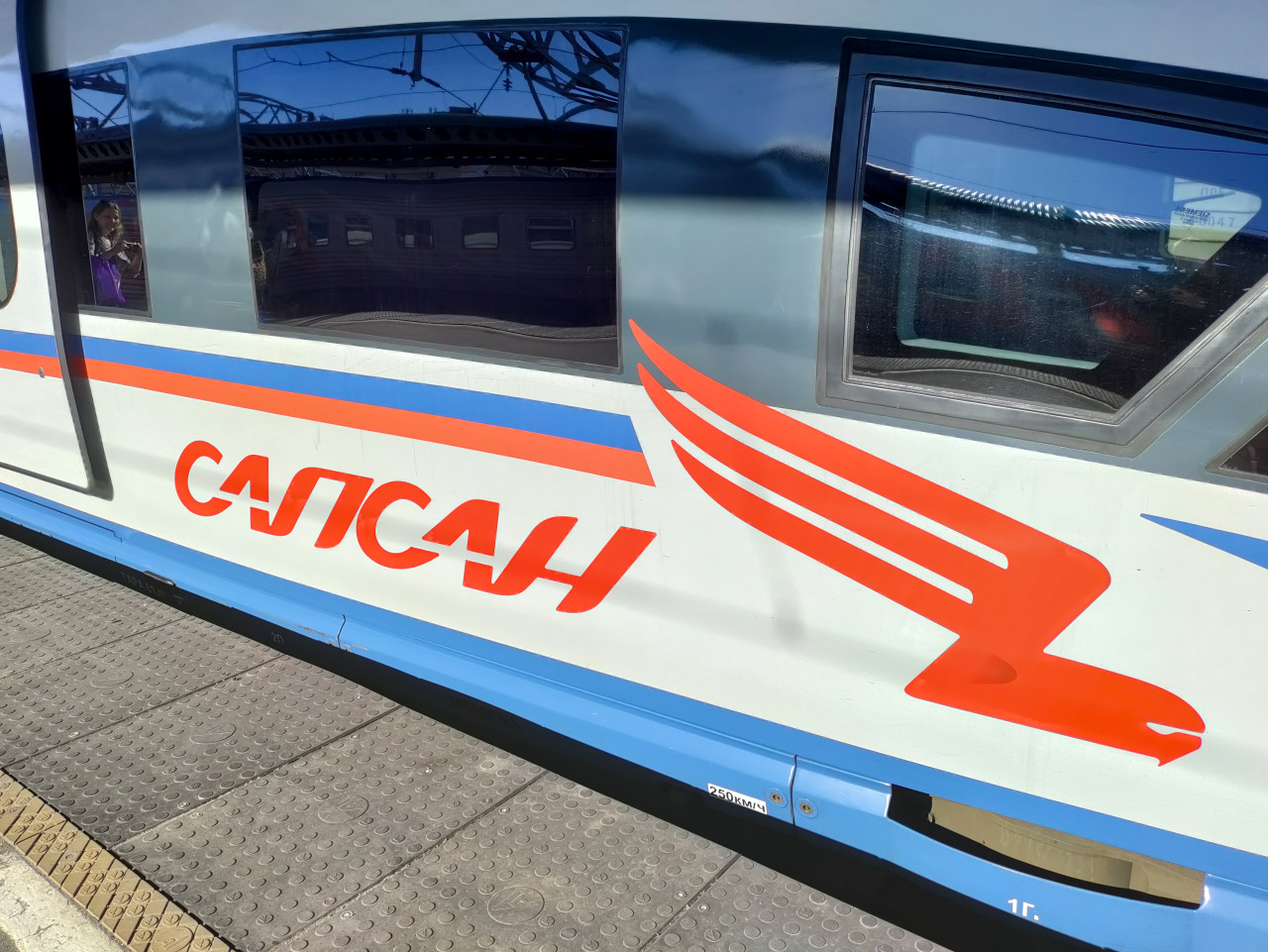 Логотип и боковая часть вагона поезда «Сапсан» на платформе