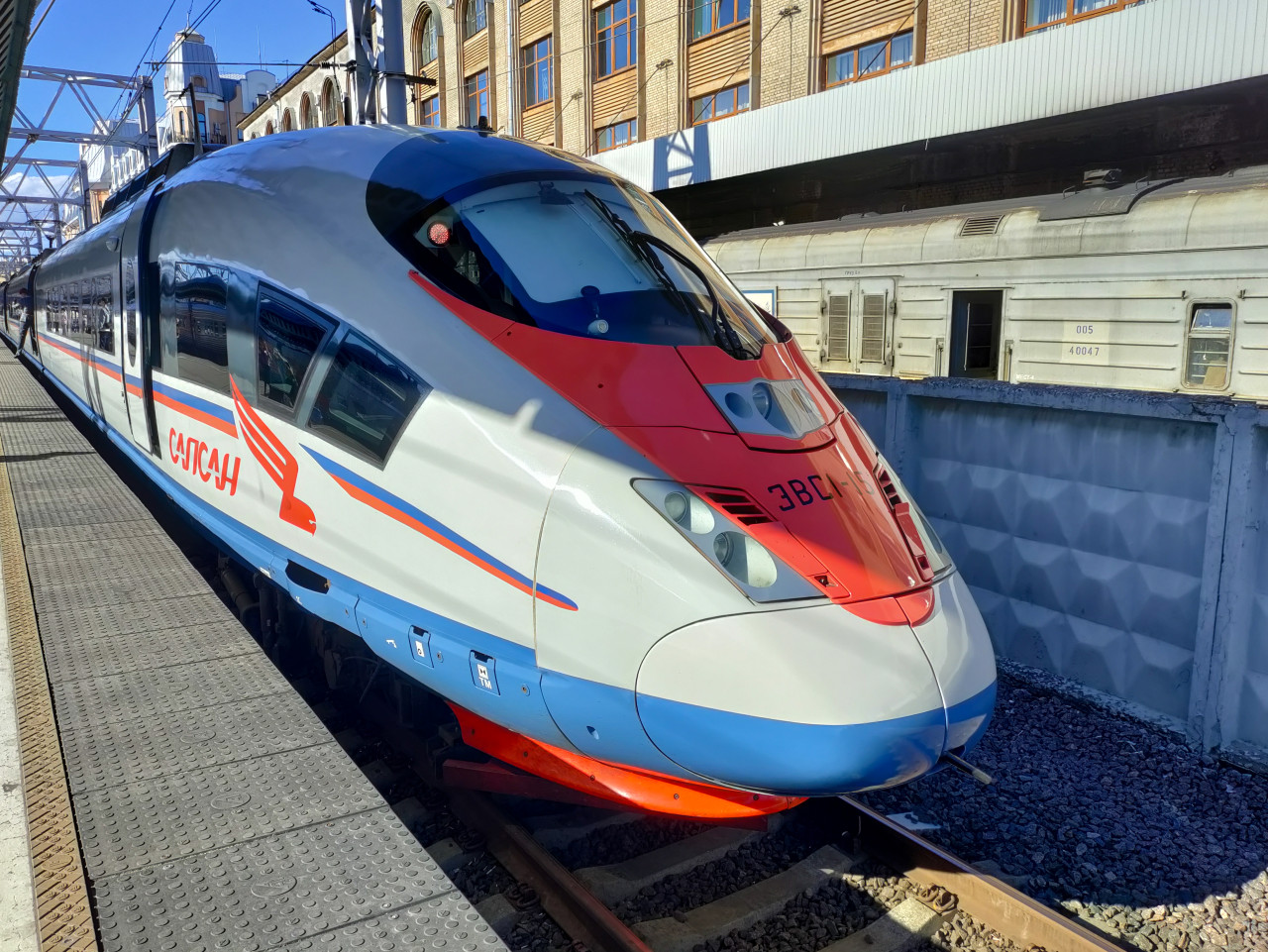 На изображении запечатлён головной вагон скоростного электропоезда «Сапсан», стоящий на путях рядом с пассажирской платформой. Хорошо различима обтекаемая форма носовой части, лобовое стекло кабины машиниста, элементы светотехники и фирменная красно-сине-белая окраска. На заднем плане видны здания вокзального комплекса и соседний подвижной состав. Поезда «Сапсан» используются на высокоскоростных линиях России с конца 2000-х годов и символизируют развитие современного железнодорожного сообщения.