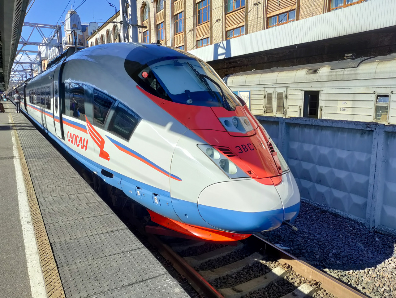 Фотография демонстрирует поезд «Сапсан», расположенный на железнодорожных путях рядом с пассажирской платформой. В кадре видна головная часть состава, рельсы, контактная сеть и здания вокзального комплекса. Чётко различимы конструктивные элементы поезда и фирменная окраска. «Сапсан» эксплуатируется на высокоскоростных маршрутах и является символом развития пассажирского железнодорожного транспорта в России. Изображение может использоваться в материалах о транспорте, инфраструктуре и путешествиях.