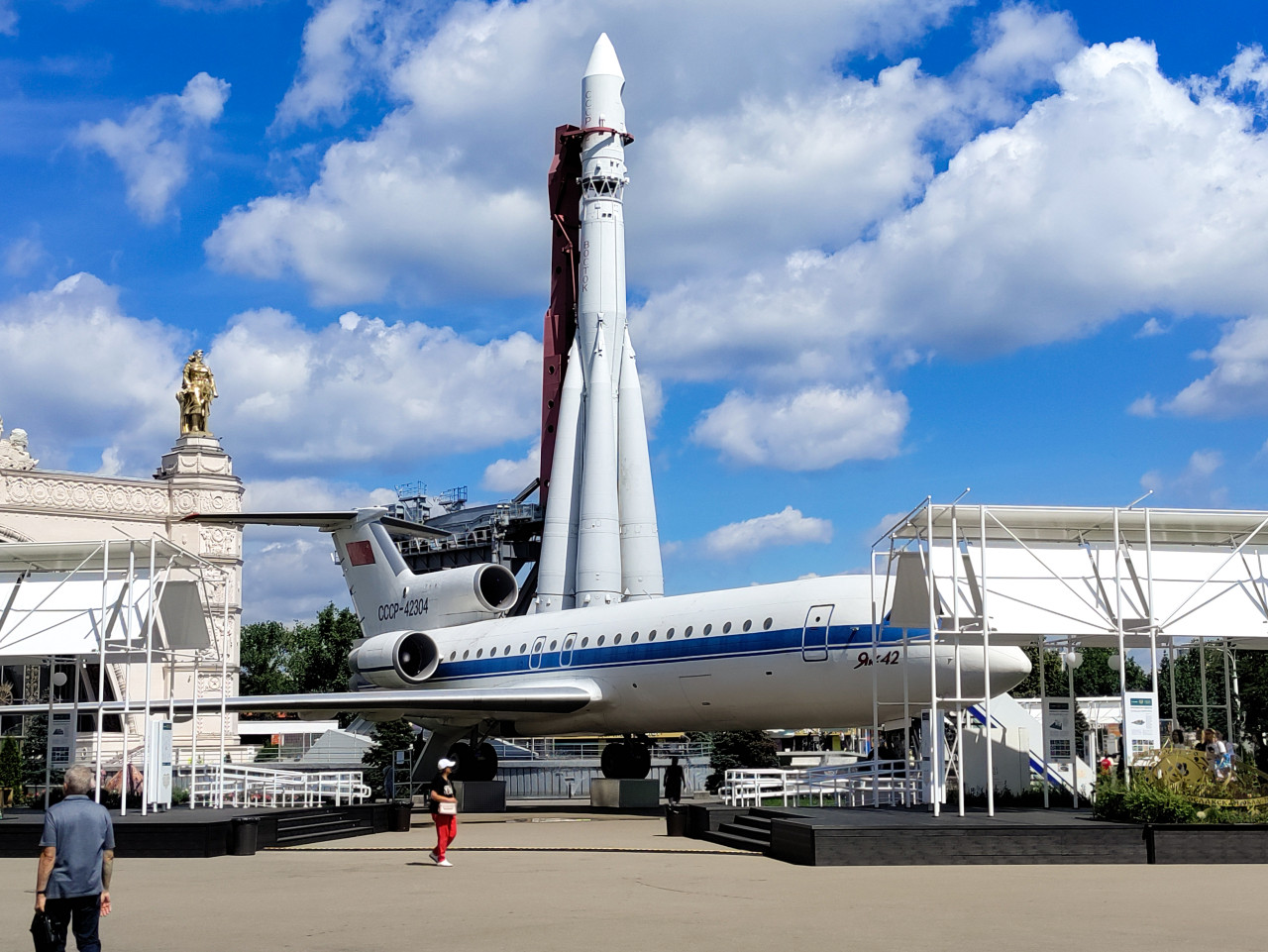 Фотография запечатлевает самолёт Як-42, установленный в качестве музейного экспоната на ВДНХ, с видом сбоку. За самолётом возвышается ракета-носитель «Восток», формируя единую композицию, посвящённую развитию авиации и космонавтики. В кадре присутствуют посетители выставки и элементы временных павильонов. Объекты ВДНХ являются важной частью культурного и исторического пространства Москвы. Снимок может использоваться в публикациях о техническом наследии, выставках и туристических маршрутах.