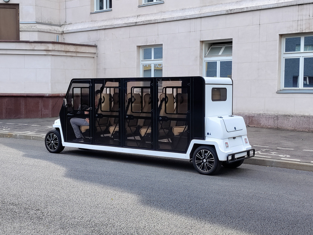 Фотография демонстрирует удлинённый пассажирский электрокар с закрытым салоном, припаркованный у тротуара на территории ВДНХ. Внутри видны отдельные сиденья для пассажиров и рабочее место водителя. Конструкция кузова включает задний служебный модуль. На заднем плане расположено здание общественного назначения с оштукатуренными стенами и оконными проёмами. Съёмка выполнена в дневное время в условиях спокойной выставочной среды. Электрокары подобного типа применяются на ВДНХ для трансфера гостей и обслуживания экскурсионных маршрутов. Фотография подходит для иллюстрации современного выставочного транспорта и городской логистики.