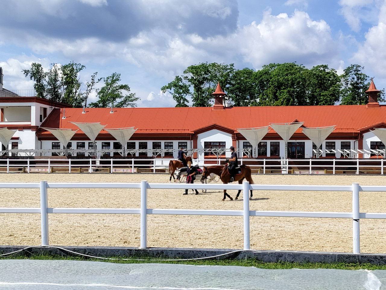 вднх конный манеж верховая езда конный спорт лошади всадники тренировка инструктор песчаная арена конный комплекс спортивный объект активный отдых городская среда туризм ВДНХ манеж обучение ограждение забор спорт досуг архитектура красная крыша открытая площадка дневная съёмка облачное небо зелёные насажденияПохожие фотографии