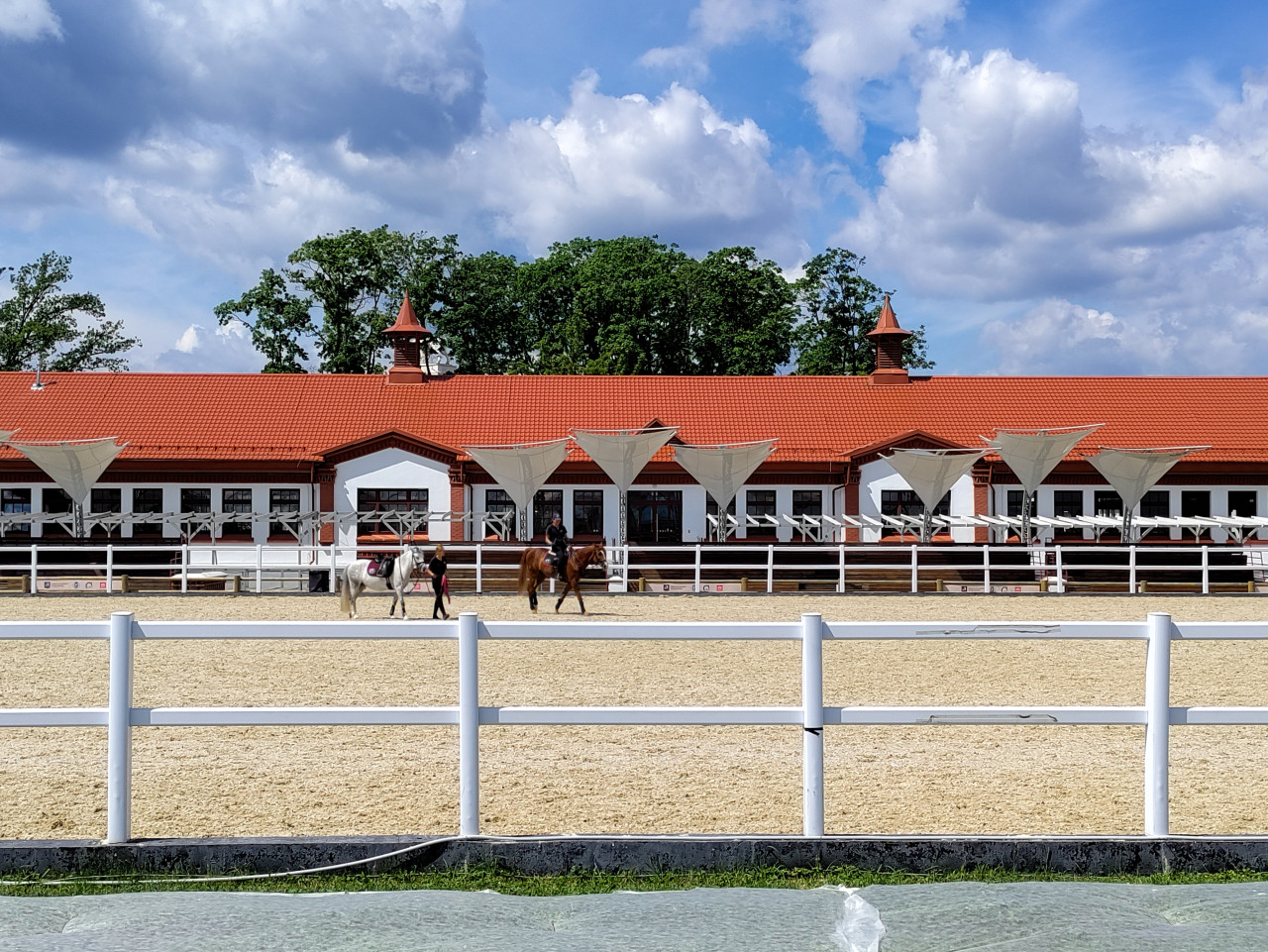 На фотографии изображён открытый конный манеж на территории ВДНХ, где проходят занятия по верховой езде. В кадре видны всадники на лошадях, движущиеся по песчаному покрытию арены, а также инструктор, сопровождающий тренировочный процесс. Манеж ограждён белым деревянным забором. На заднем плане расположены здания конного комплекса с красной черепичной крышей и навесами для зрителей. Съёмка выполнена днём при переменной облачности. Фотография может использоваться для иллюстраций тем спорта, активного отдыха и инфраструктуры ВДНХ.