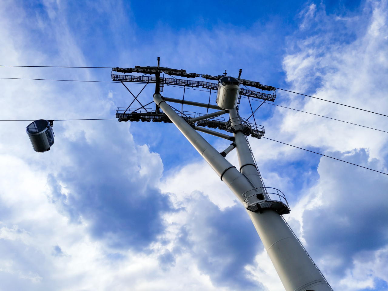 Фотография показывает пассажирские кабины Московской канатной дороги в момент прохождения опорной мачты. В кадре видны тросы, роликовые блоки, металлическая конструкция опоры и кабины, движущиеся в противоположных направлениях. Съёмка подчёркивает устройство канатной системы и масштаб инженерных решений. Московская канатная дорога была построена как элемент транспортно-туристической инфраструктуры города. Изображение подходит для иллюстраций о городском транспорте, инженерных объектах и современных системах передвижения.