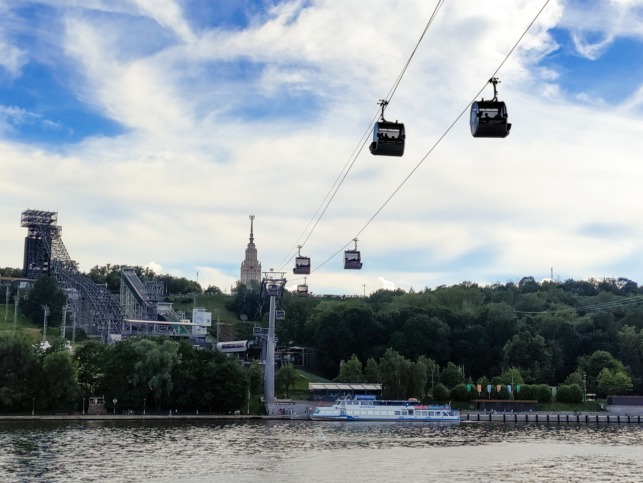 На снимке показаны несколько кабин Московской канатной дороги, движущихся над Москвой-рекой в направлении Воробьёвых гор. В кадре различимы тросы, опорная мачта, речное судно у причала и зелёные массивы парковой зоны. На возвышенности виден главный корпус Московского государственного университета имени М. В. Ломоносова, одного из самых известных архитектурных ансамблей Москвы середины XX века. Канатная дорога, открытая в 2018 году, используется как транспортный и экскурсионный маршрут. Фотография может применяться в публикациях о городской инфраструктуре, туризме и панорамах столицы.