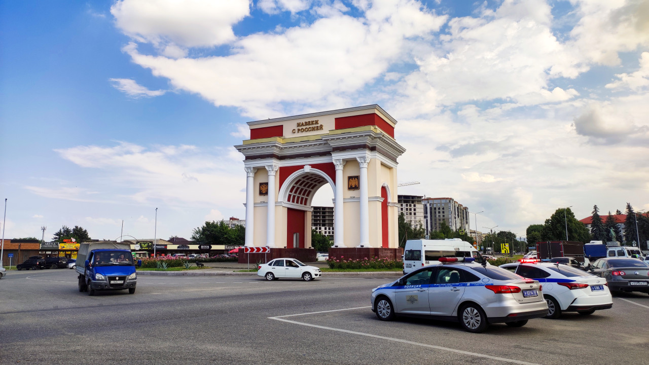 архитектура триумфальная арка памятник архитектуры исторический объект городская среда транспортная инфраструктура дорожное движение автомобили общественное пространство нальчик кабардино балкария россия арка дружбы навеки с россией въезд в городПохожие фотографии